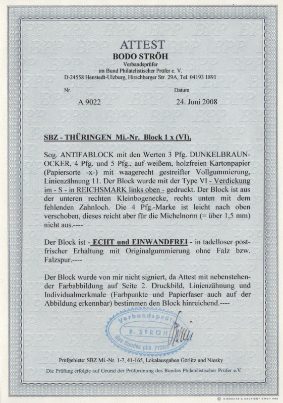 Thüringen, 1945, Bl. 1 x vom ER, **, mit Fotoattest Ströh BPP: "echt + einwandfrei", Luxusstück. Sehr selten!