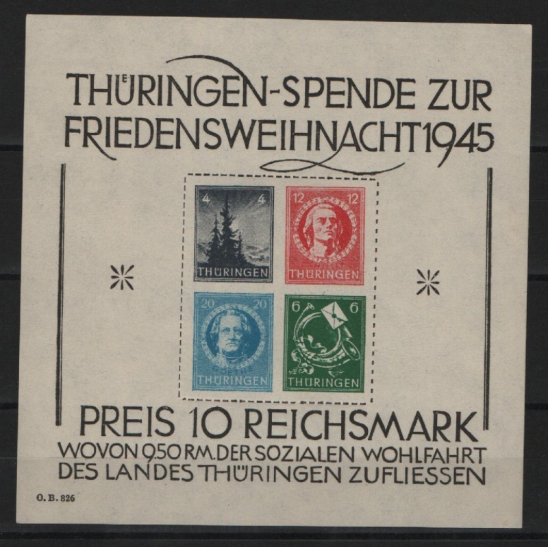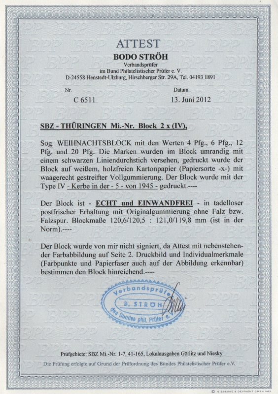Thüringen, 1945, Bl. 2 x , **, mit Fotoattest Ströh BPP: echt + einwandfrei, Luxusstück. Sehr selten!