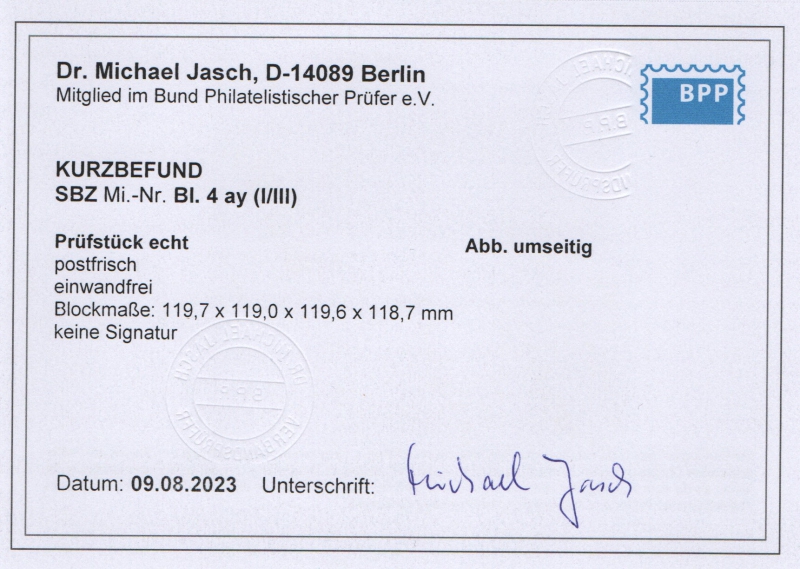 Thüringen, 1946, Bl. 4 a y, **, mit akt. Kurz- Befund Dr. Jasch BPP: "echt + einwandfrei", Luxusstück!