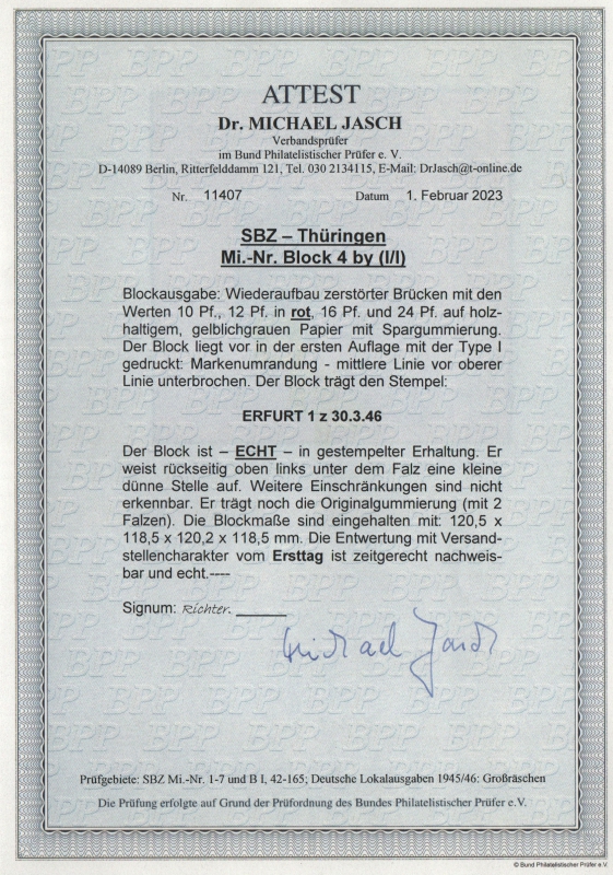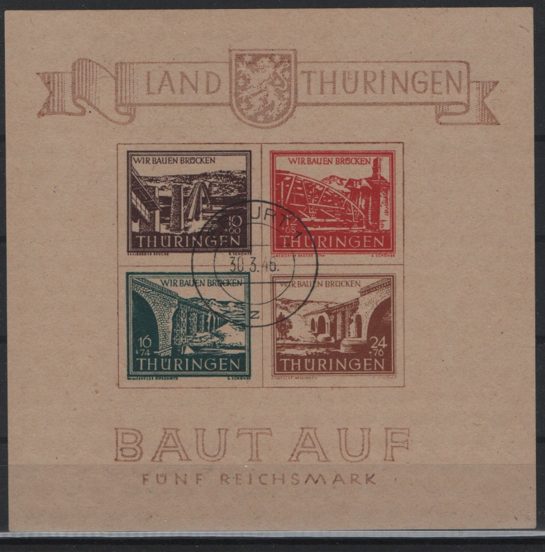 Thüringen, 1946, Bl. 4 yb, gestempelt, mit akt. Fotoattest Dr. Jasch BPP: echt + ...., Kabinett- / Bedarfsstück, sehr selten!
