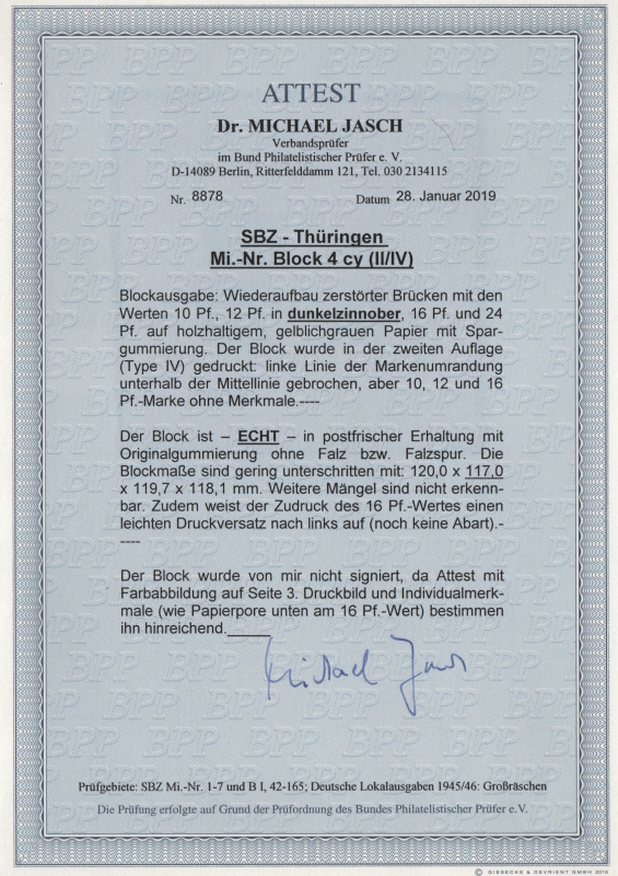 Thüringen, 1946, Bl. 4 yc, **, Fotoattest Dr. Jasch BPP: "echt + ....", Kabinettstück, sehr selten!