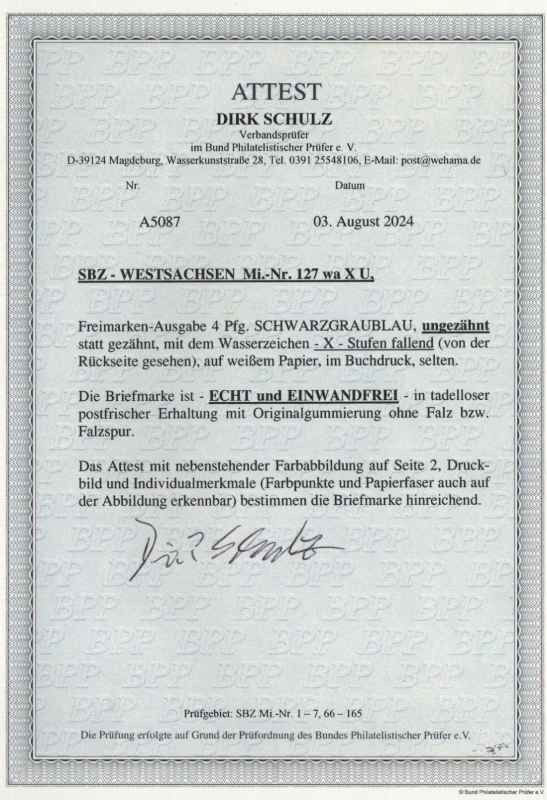 SBZ, West- Sachsen, 1945, Mi.- Nr.: 127 X wa U, **, akt. Fotoattest Schulz BPP: e+e! Luxusstück! RR!