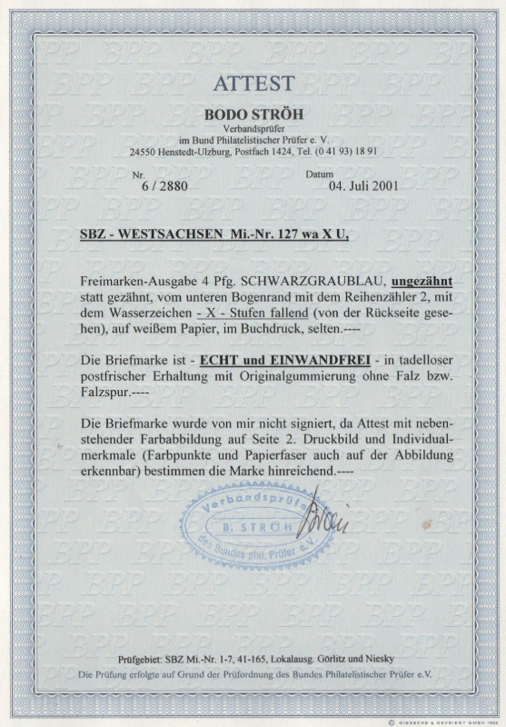 SBZ, West- Sachsen, 1945, Mi.- Nr.: 127 X wa U (mit Ur), **, Fotoattest Ströh BPP! Luxusstück! RR!