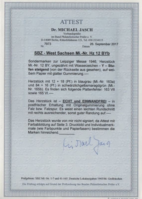 SBZ, West- Sachsen, 1946, Mi.- Nr.: Hz. 12 BYb, **, Fotoattest Dr. Jasch BPP: "echt und einwandfrei"! Luxusstück! RR!