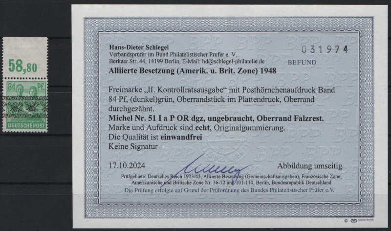 Bizone, 1948, Mi.- Nr.: 52I P OR dgz, OR * (nur kl. Falzrest auf OR) / Marke **, akt. Befund Schlegel BPP! Selten!