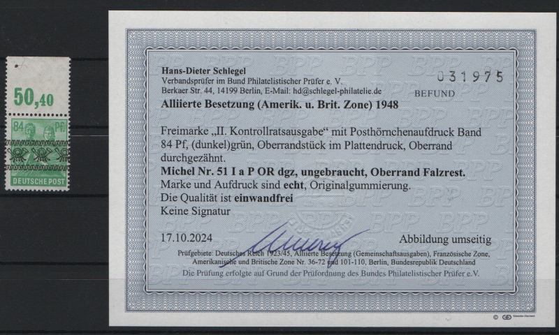 Bizone, 1948, Mi.- Nr.: 52I P OR dgz, OR * (nur kl. Falzrest auf OR) / Marke **, akt. Befund Schlegel BPP! Selten!