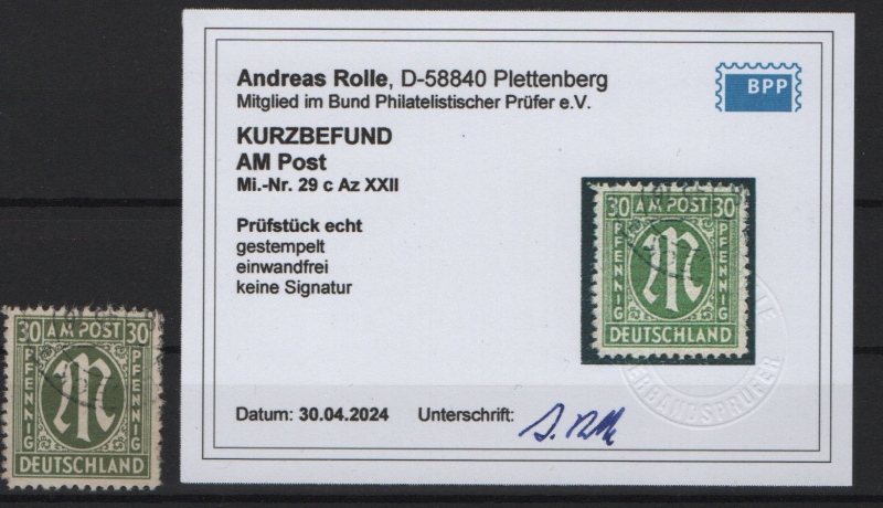 Bizone, AM- Post, 1945, Mi.- Nr.: 29 c Az (mit Plf. XXII), gestempelt, akt. K.- Befund Rolle BPP; "e+e"! Luxusstück! Selten!
