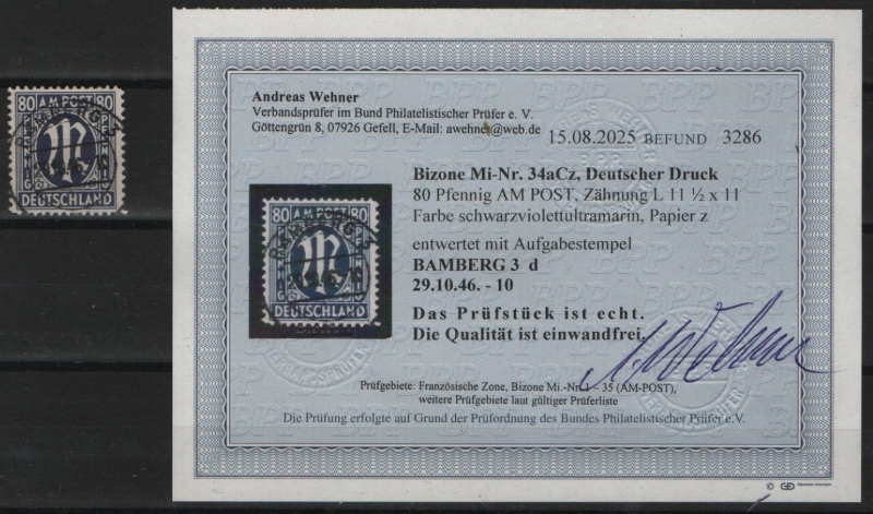 Bizone, AM- Post, 1945, Mi.- Nr.: 34 a Cz, gestempelt, akt. Befund Wehner BPP; e+e! Luxusstück! Selten!