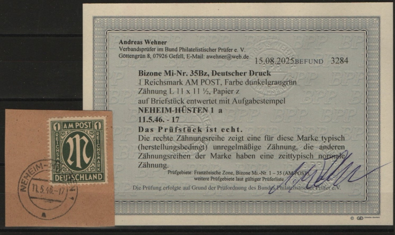 Bizone, AM- Post, 1945, Mi.- Nr.: 35 Bz, auf kl. Briefstück, akt. Befund Wehner BPP; e+ ..... e! Gutes Bedarfsstück! Selten!