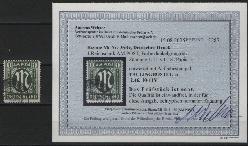 Bizone, AM- Post, 1945, Mi.- Nr.: 35 Bz, auf kl. Briefstück, akt. Befund Wehner BPP; e+e! Gutes Bedarfsstück! Selten!