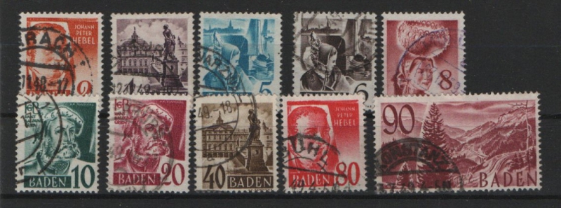 FRZ - Baden, 1948 /49, Mi.- Nrn.: 28 - 37, gestempelt, selten!