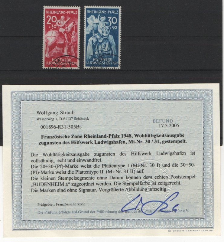 FRZ, Rheinland- Pfalz, 1949, Mi.- Nrn.: 30 I + 31 II, gestempelt, Befund Straub BPP!