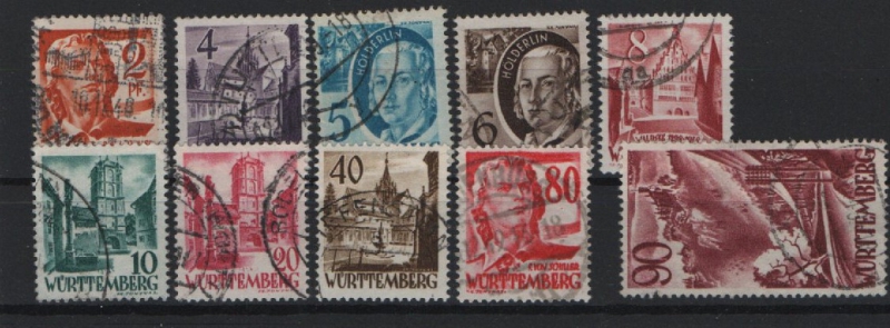 FRZ - Württemberg- Hohenzollern, 1948 / 49, Mi.- Nrn.: 28- 37, gestempelt, Kabinettsatz! Selten!