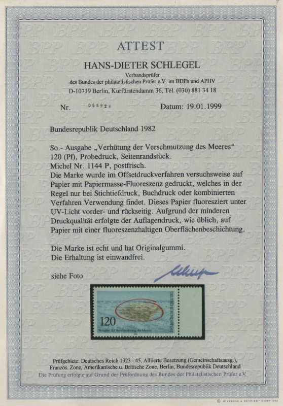 BRD, 1982, Mi.- Nrn.: 1144P vom SR, **, Fotoattest Schlegel BPP; "echt + einwandfrei"! Luxusstück!