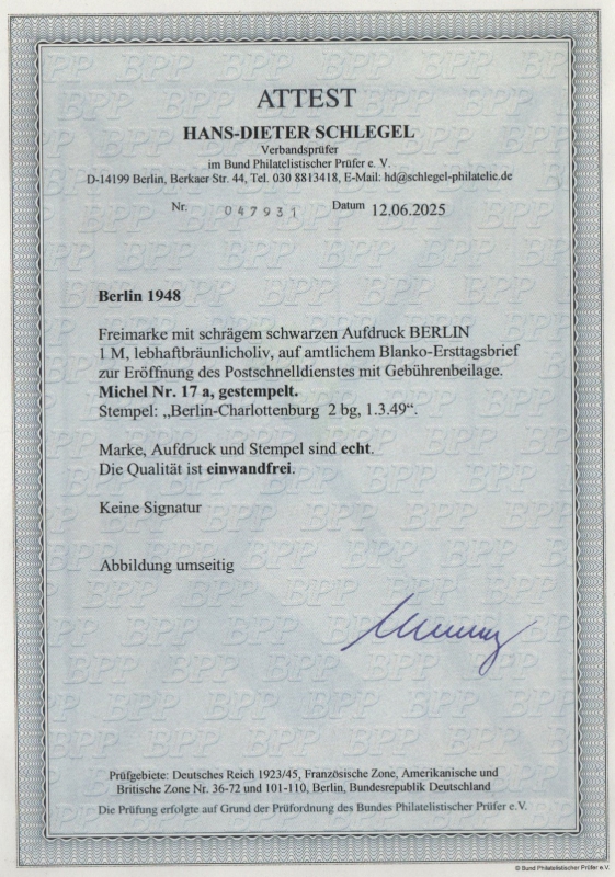 Berlin, 1948, Mi.- Nr.: 17 a, auf Postschnelldienst- FDC! Akt FA Schlegel BPP; " e+e"! Luxusstück! Selten!