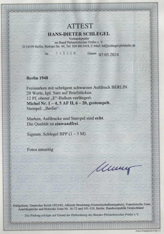 Berlin, 1948, Mi.- Nrn.: 1- 20, kpl., Der Schwarz- Aufdruck- Satz, auf 4 Briefstücken, akt. FA Schlegel BPP: e+e! Selten!