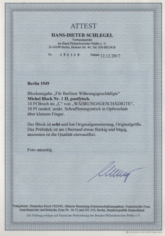 Berlin, 1949, Mi.- Nr.: Bl. 1 II, **, mit  Fotoattest Schlegel BPP! e+ ....! Kabinettstück!