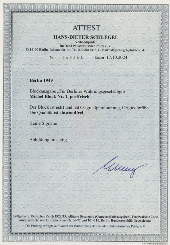 Berlin, 1949, Mi.- Nr.: Bl. 1, postfrisch, mit akt. Fotoattest Schlegel BPP! echt und einwandfrei! Luxusstück! Selten!