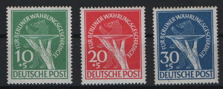 Berlin, 1949, Mi.- Nrn.: 68- 70, **, "Der Währungsgeschädigten- Satz", kpl. Satz, je tiefstgeprüft Schlegel BPP! Luxussatz!