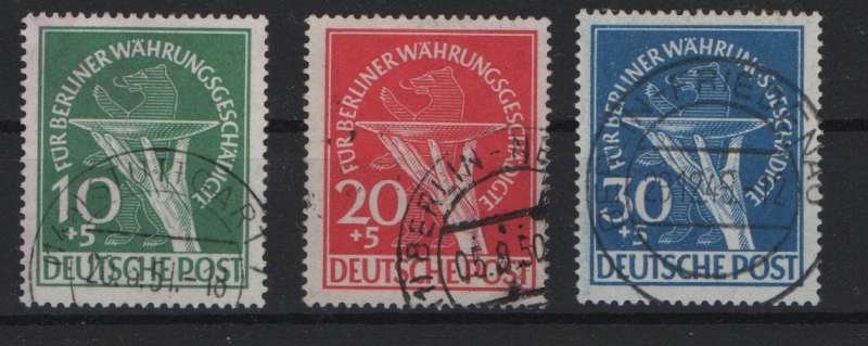 Berlin, 1949, Mi.- Nrn.: 68- 70, "Der Währungsgeschädigtensatz" gestempelt, kpl. Satz, je tiefstgeprüft Schlegel BPP! Luxussatz!