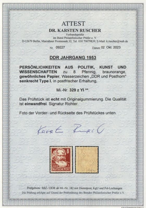 DDR, 1953, Mi.- Nr.: 329 za YI, postfrisch / **, aktuelles Fotoattest Dr. Ruscher BPP: "echt und einwandfrei"! Luxusstück! RR!