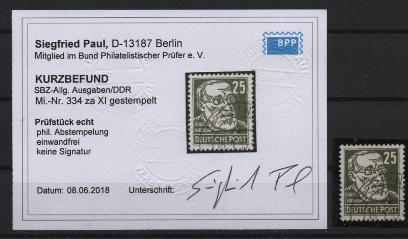 DDR, 1953, Mi.- Nr.: 334 z XI, Phil.- gestempelt, K.- Befund Dr. Ruscher BPP: echt + einwandfrei! Luxusstück!