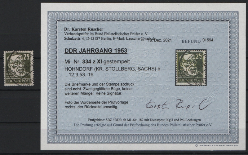 DDR, 1953, Mi.- Nr.: 334 z XI, bedarfsgestempelt (!), aktueller Befund Dr. Ruscher BPP: "echt + ..."! Gutes Bedarfsstück!