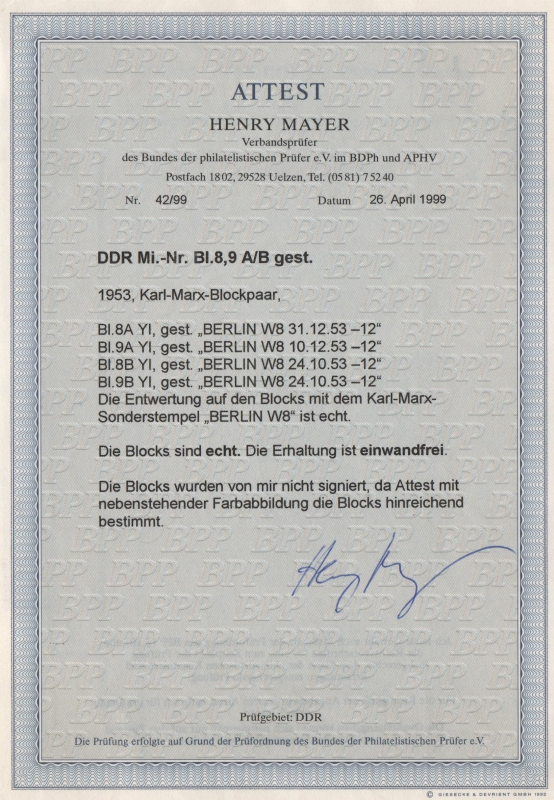 DDR, 1953, Mi.- Nrn.: Bl. 8/9 A/B, gestempelt, Fotoattest Meyer BPP: echt + einwandfrei! Je mit passendem Sonderstempel!