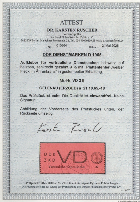 DDR, 1965, ZKD D, Mi.- Nr.: 2 Plf. II, gestempelt! Akt. Fotoattest Dr. Ruscher BPP: "echt+ einwandfrei"! Luxusstück! Rarität der DDR!