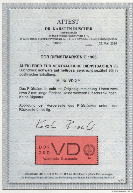 DDR, 1965, ZKD D, Mi.- Nr.: 2, **, akt. Fotoattest Dr. Ruscher BPP: "echt+ ..."! Kabinettstück!