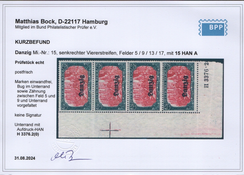 Danzig, 1920, Mi.- Nr.: 15 B + HAN (+3 SR- Marken), **, K.- Befund Bock BPP! Kabinettstück!