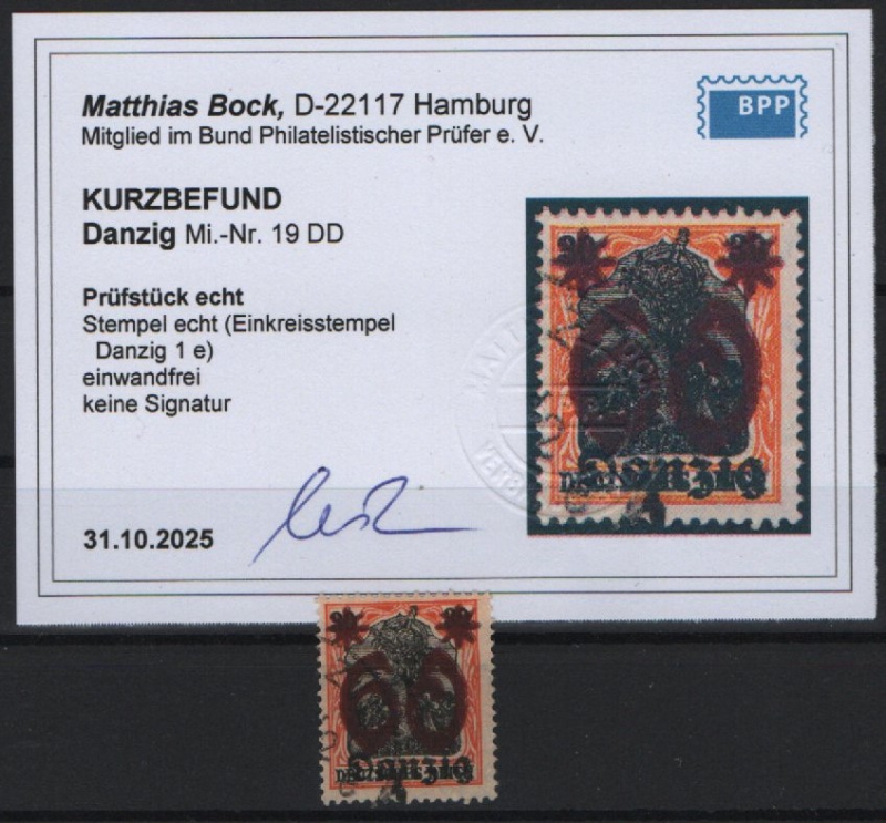 Danzig, 1920, Mi.- Nr.: 19 DD, gestempelt, akt. K.- Befund Bock BPP: e+e! Luxusstück! Sehr selten! RR!
