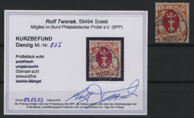 Danzig, 1921, Mi.- Nr.: 83 I, gestempelt, KB Tworek BPP: "e+e"! Qualitätsstück! Selten!