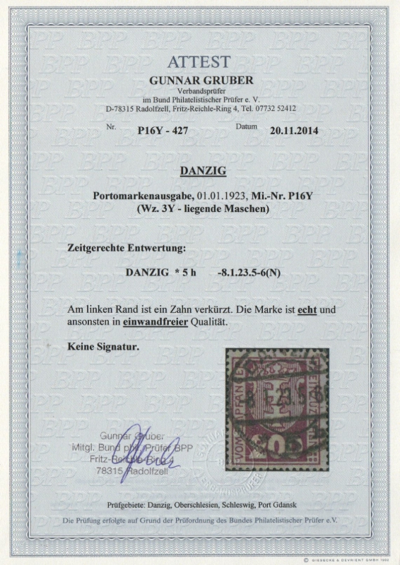 Danzig, 1923, Mi.- Nr.: P 16 Y, gestempelt, Fotoattest Gruber BPP; "e+ ...,e"! Gutes Bedarfsstück! Sehr selten!