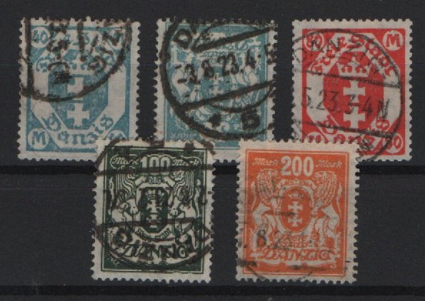 Danzig, 1923, Mi.- Nrn.: 138- 42, bedarfsgestempelt, je im Block geprüft Infla Berlin! Selten!