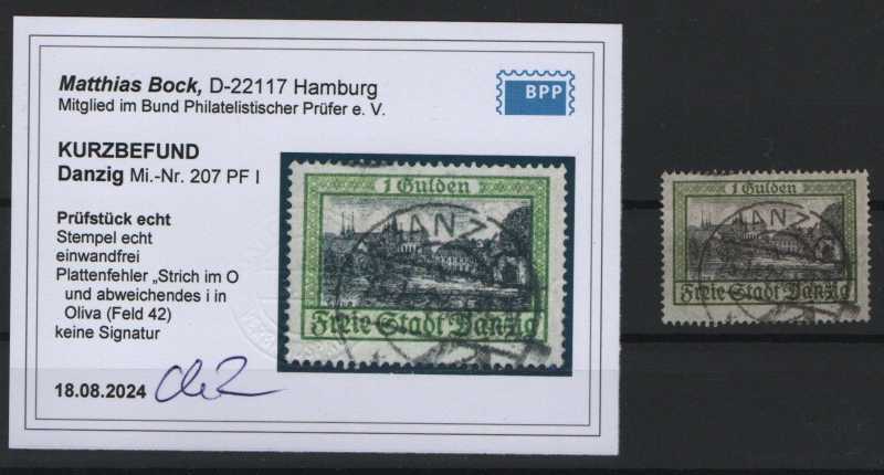 Danzig, 1924, Mi.- Nr.: 207 PF I, gestempelt, akt. K.- Befund Bock BPP: "e+e"! Luxusstück! Selten!