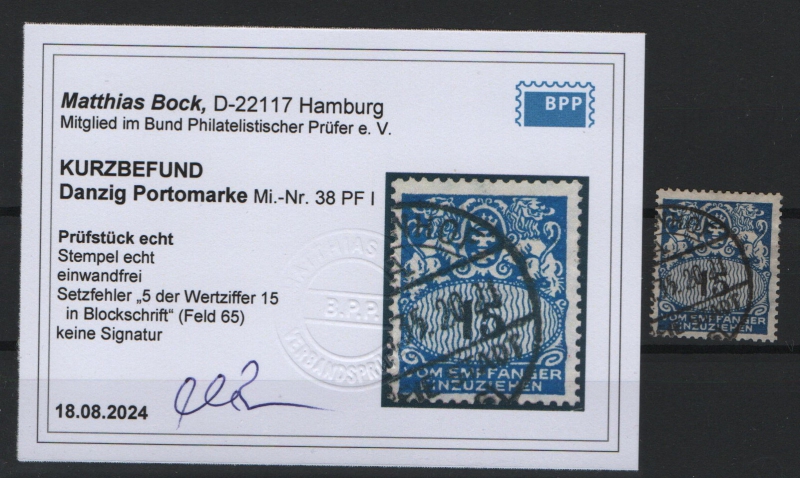 Danzig, 1927, Mi.- Nr.: P 38 PF I, gestempelt, KB Bock BPP: "e+e"! Luxusstück! Selten!