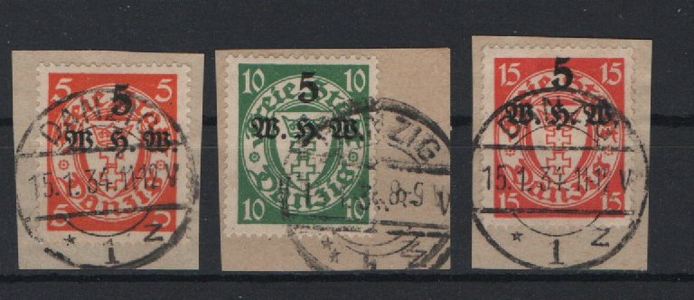 Danzig, 1934, Mi.- Nrn.: 237- 239, je auf kl. Briefstück, je tief(st)geprüft Kniep BPP! Qualitätssatz!