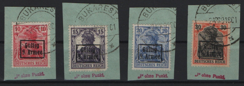 Dt. Bes. I. WK., 1918, M.V.i.R. / 9. Armee, Mi.- Nr.: 1-4, je auf auf kl. Briefstück! Selten!