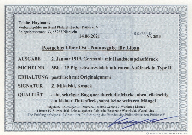 Dt. Bes. I. WK., Postgebiet Oberbefh. Ost, Notausgabe Libau, Mi.- Nr.: 3 B b, **, Befund Huylmans, Kabinettstück! Sehr selten!