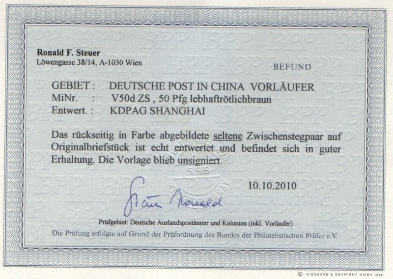 Dt. Auslandspostämter, China, 1891 / 98, Mi.- Nr.: V 50d ZS , gestempelt! FB Steuer BPP; " e + gute Erhaltung"! Sehr selten!