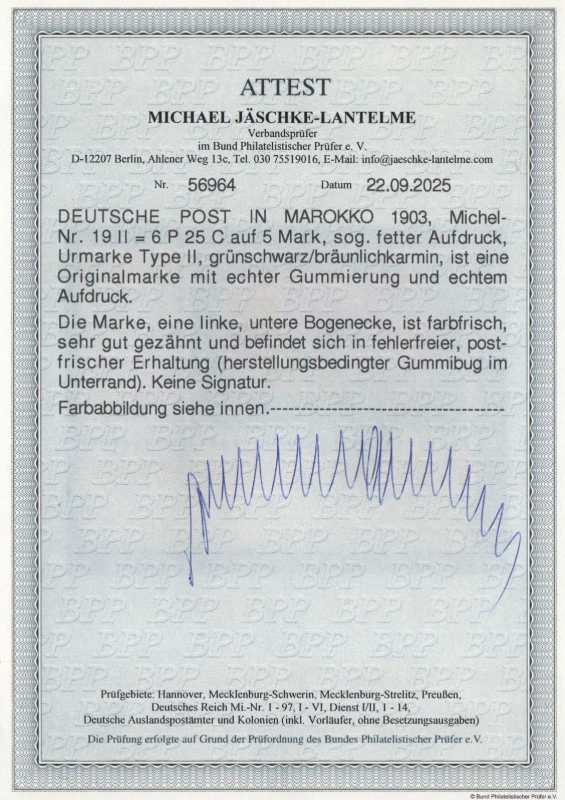 Dt. Auslandspostämter, Marokko, 1903, Mi.- Nrn.: 19 II, **, mit Er.! Akt. Fotoattest Jäschke- L. BPP; e+e! Sehr selten!