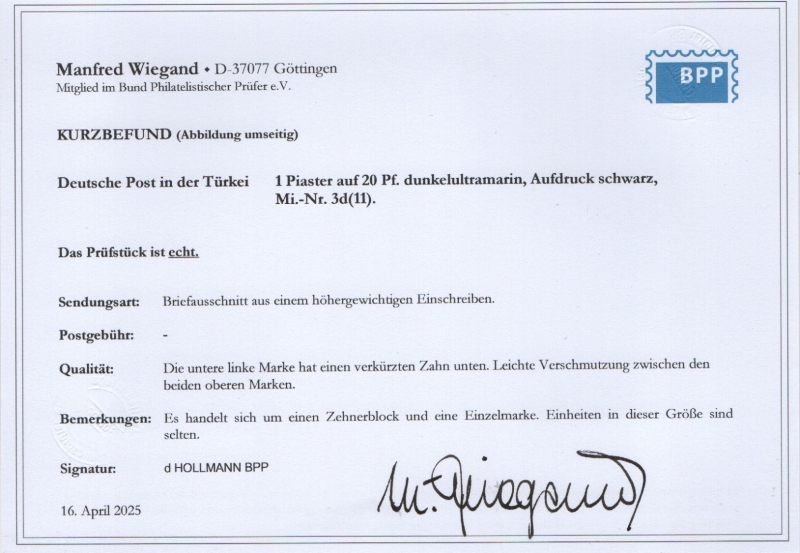 DAP Türkei, ca. 1886, Mi.- Nr. 3d (11x), gestempelt auf Briefstück, geprüft Hollmann BPP / Befund Wiegand BPP! Selten!
