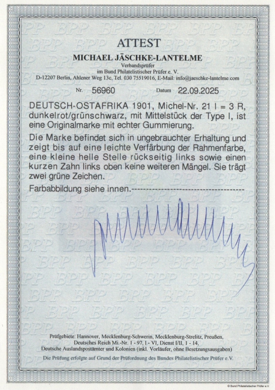 Dt. Kolonien, DOA, 1901, Mi.- Nr.: 21 Typ I, *, akt. FA Jäschke- L. BPP: "e+ ...."! Selten!