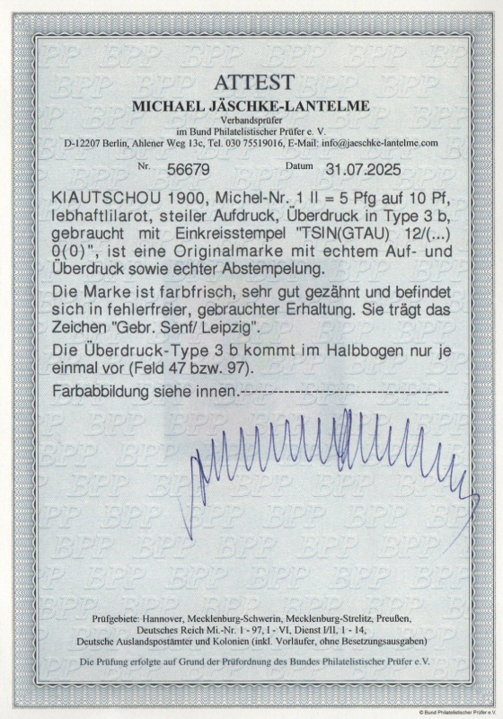 Dt. Kolonien, Kiautschou, 1900, Mi.- Nr.: 1 II, Type 3b, gestempelt! Akt. FA Jäschke- L. BPP: e+e! Sehr selten!