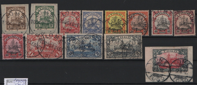 Dt. Kolonien, Togo, 1900, Mi.- Nrn.: 7- 19, gestempelt / auf Briefstück, Nrn.: 16- 19 je geprüft / signiert! Sehr selten!