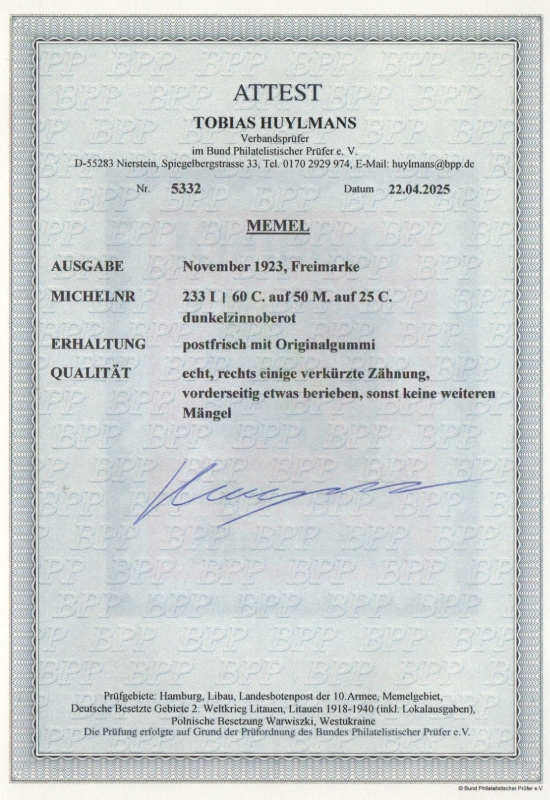 Memel, 1923, Mi.- Nr.: 233 I, **, akt. Fotoattest Huylmans BPP: "e+ ..."! Kabinettstück! Selten!