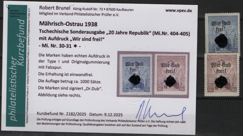 III. Reich / Dt. Bes. Sudetenland, 1938, Mährisch- Ostrau, Mi.- Nr.: 30 + 31, *! Akt. FB Brunel VPeV. : e+ e! Selten!