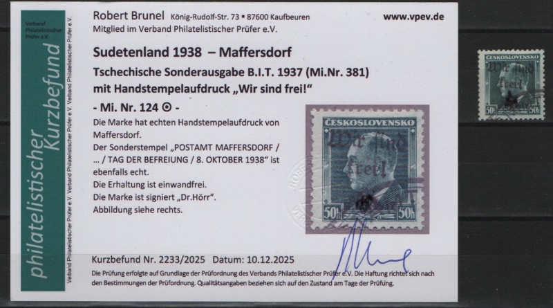 III. Reich / Dt. Bes. Sudetenland, 1938, Maffersdorf, Mi.- Nr.: 124, gestempelt! Akt. FB Brunel VPeV. : e+e! Selten!