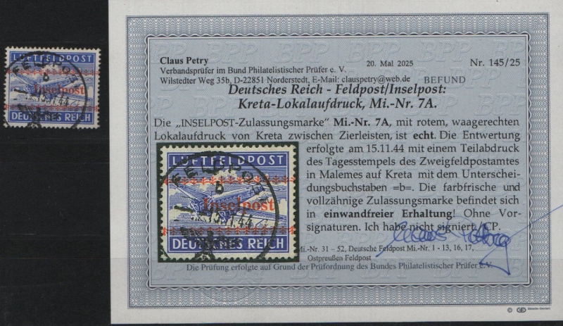 III. Reich, Feldpost / Inselfeldpost, 1944, Mi.- Nr.: 7 A, gestempelt, akt. Befund Petry BPP: echt + einwandfrei! Luxusstück!
